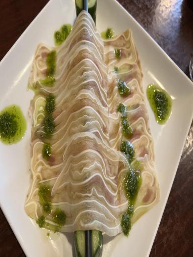 唐辛子と四川山椒の特製麻辣ソースをかけた辛さが際立つ一品だが、食材の異なる食感が楽しく、これも美味。