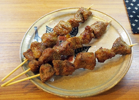 さて、写真は手前から普通、辛目、激辛。激辛は辛そうに見えないけど、串を90°回転させると、お肉に真っ赤なものがいっぱいかかってる~。