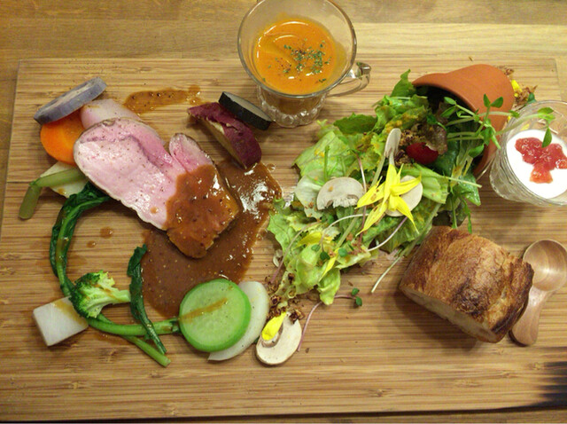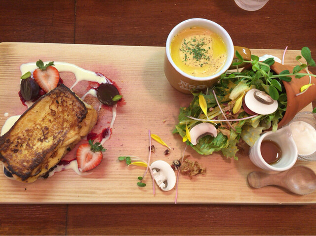 まず、木のプレートに盛り付けられたサラダとスープが運ばれ、最後に焼きたてのフレンチトーストをのせてくれます。