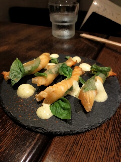 ここはおしゃれで美味い!締めに蕎麦が食べれるのもいい、今日はまぐろのポテサラ、地鶏、海老春巻き、豚のロースト、締めに蕎麦をあ頂いた。