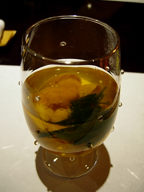 ちょっとかわいいグラスにうに・えび・数の子がゼリー寄せになった前菜。