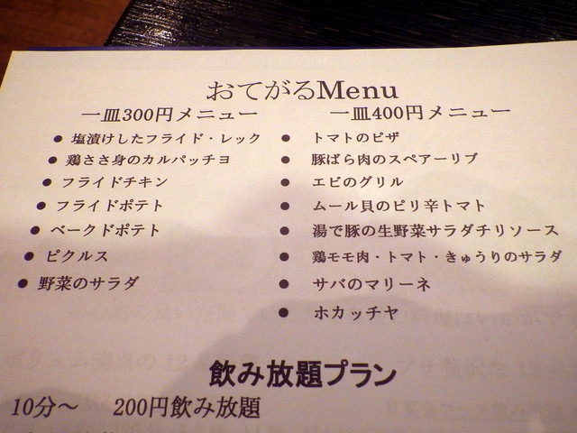 ささ身のカルパッチョ(300円)やトマトのピザ(400円)などに代表されるように