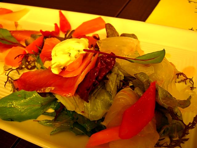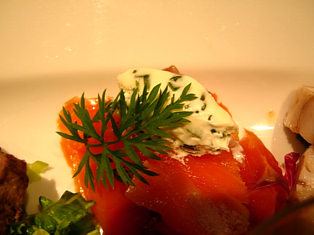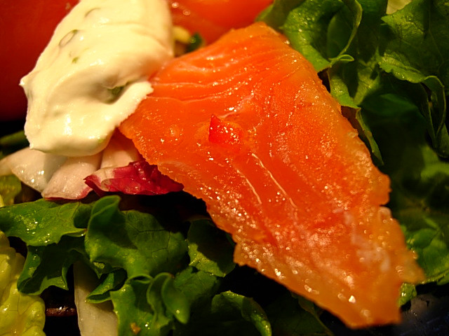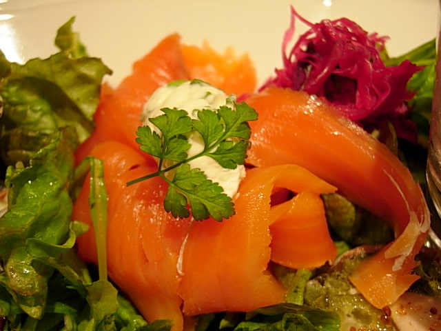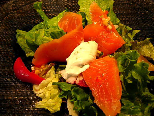 自家製スモークサーモンのサラダ仕立て、サワークリームソース