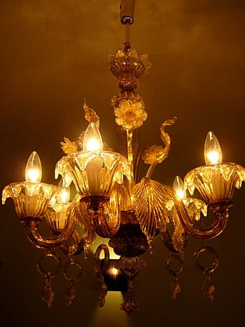 天井から下がるベネチアングラスのノスタルジックなシャンデリアが