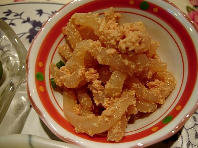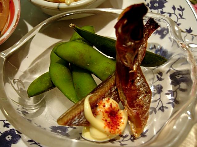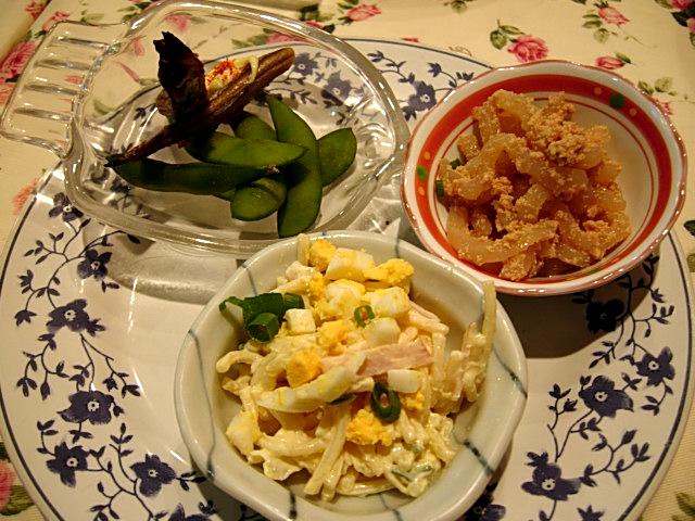 すべて自家製でスパゲッティのサラダ、こんにゃくのたらこ和え、枝豆とししゃもです。