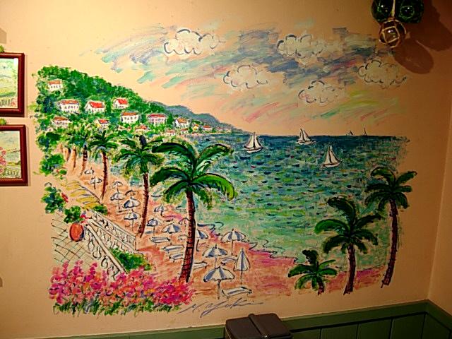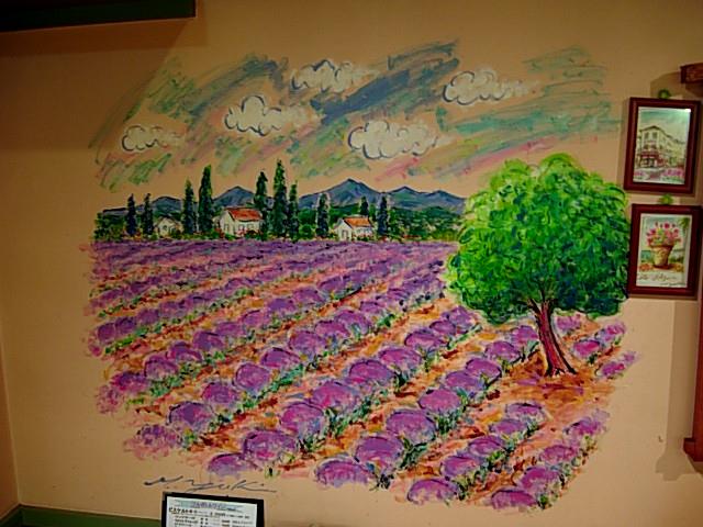 店内はカウンター席と、小上がり席で構成され 右手の壁には絵が2枚大きく描かれています。