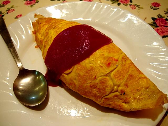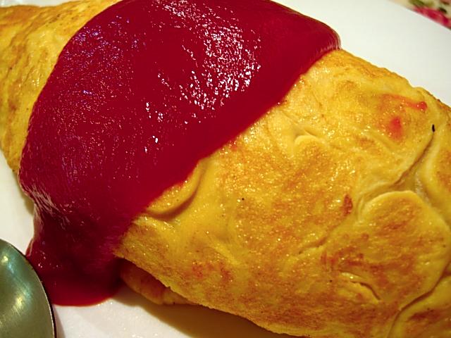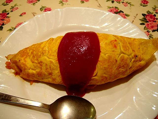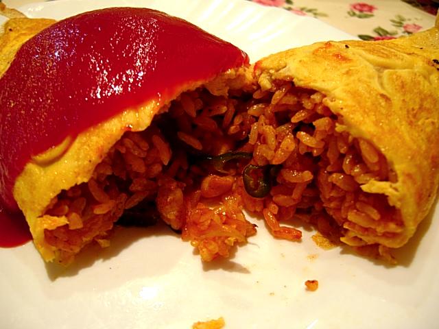 見た目は普通のオムライスですが割ってみるとおいしそうなチキンライスが出てきます。