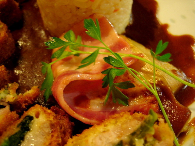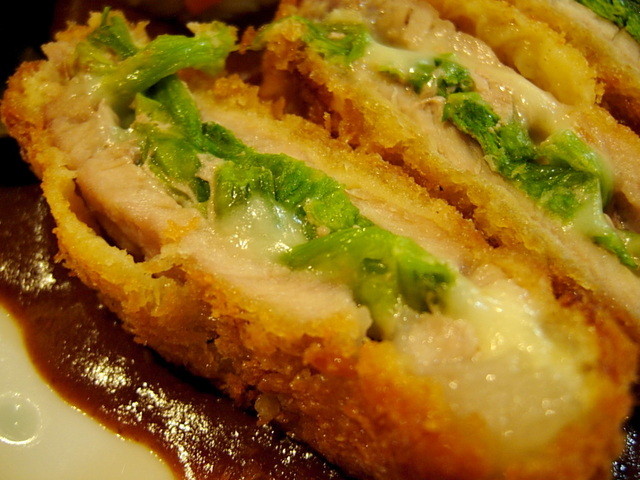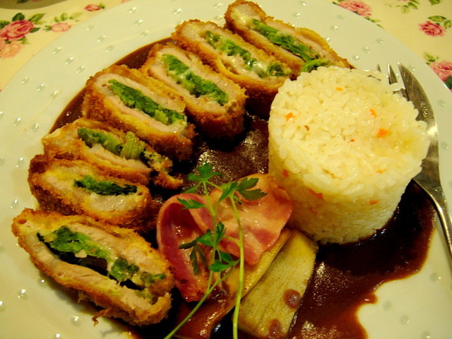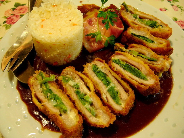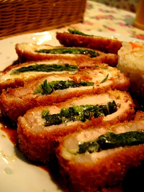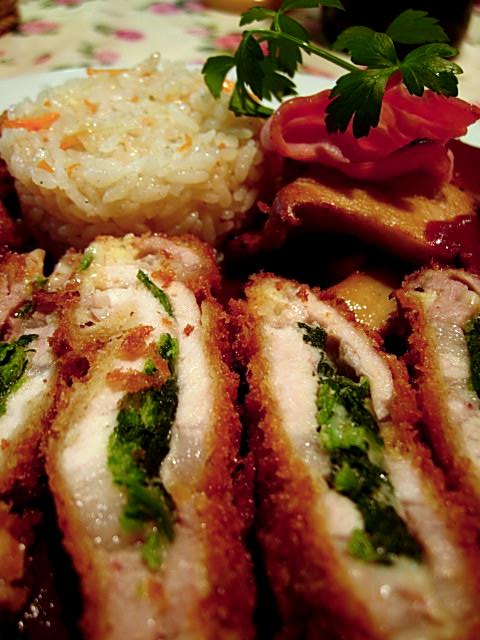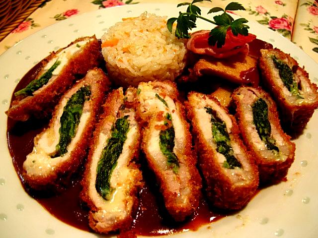 味付けされたほうれん草とチーズを挟み込んだ豚肉をフライにしたボリューミーな一皿です。