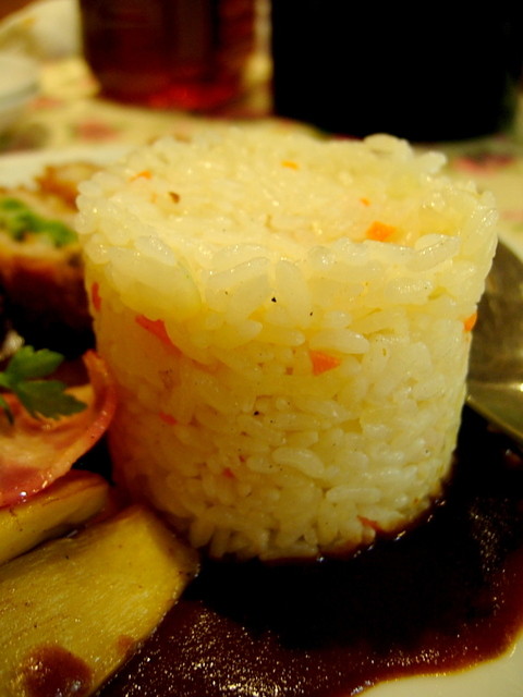 さらに上品な味付けのバターライスにたっぷりの特製デミグラスソースがかかっています。