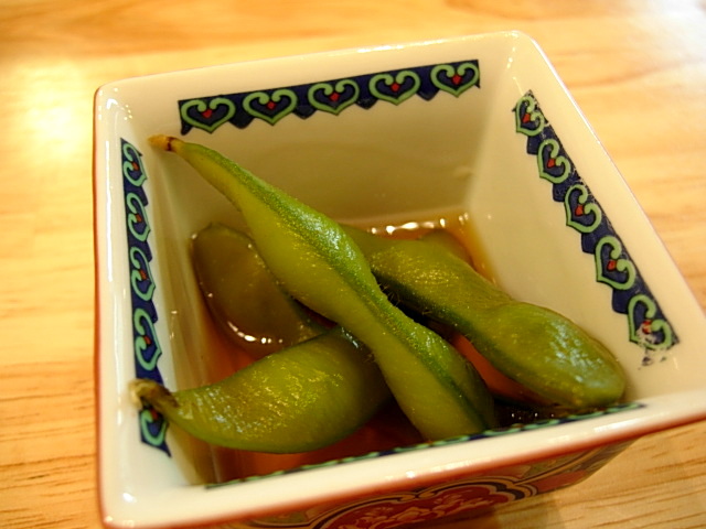 お通し(アルコールオーダー時のみ)として枝豆の老酒漬けが登場。