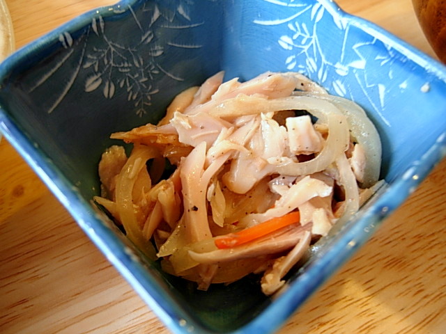 小鉢は人気メニュー鶏の半身焼きをほぐしたもの。