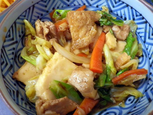 野菜炒めは厚揚げが入り味付けも家庭的な感じで美味しいです。