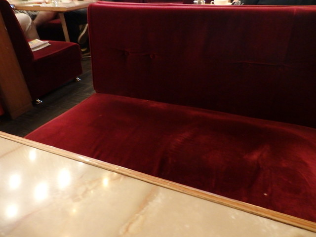 シャンデリアの下には、赤いベルベットのソファーが連なります。