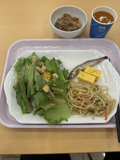 ご飯はホクホク、煮物は優しい懐かしい味、さらにサラダは新鮮なお野菜で大満足。