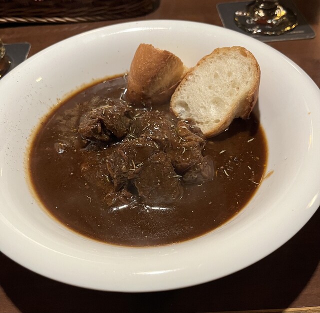 曇りの平日の11:40分頃訪問。週変わりランチの豚バラ肉の白ワイン煮(税込み1,200円)を注文。スープ、サラダ、飲み物付き。煮込みにはさやえんどうと丸いポテトが入っている。パンはソースを付けて食べた。なかなかおいしい。
