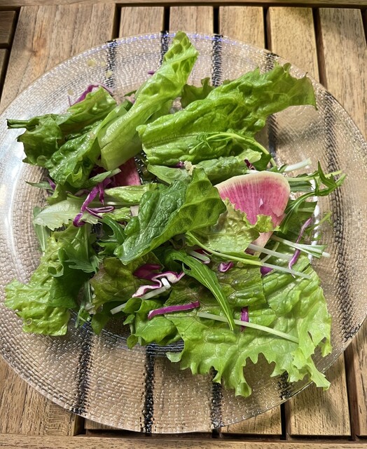 お刺身と蒸籠蒸し御膳(内税1,300円)を注文。サラダ付きである。刺身の内容はスタッフが説明してくれたのだが、アジなどだったと思う。美味しい。蒸籠の中には豚肉、にんじん、さつまいも、白菜などが入っている。これも美味しい。更に青菜の小皿が付いている。近頃、野菜が高いはずである。十分満足した。