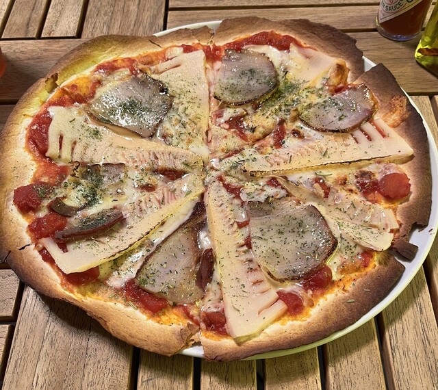 薄く切ったベーコンと細く切った牛蒡のピザ(内税1,200円)を注文。サラダが付いている。ピザだが個性的で満足。牛蒡の調理には手間がかかっただろうな。機械でできるのだろうか。