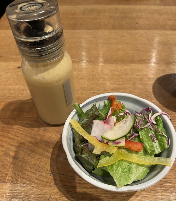 かき揚げと鶏肉のハムのランチを注文(内税1,000円)。サラダが付いている。レンコンの小鉢が付いている。サラダと味噌汁は普通だと思うが、ライスを含めて他はおいしい。