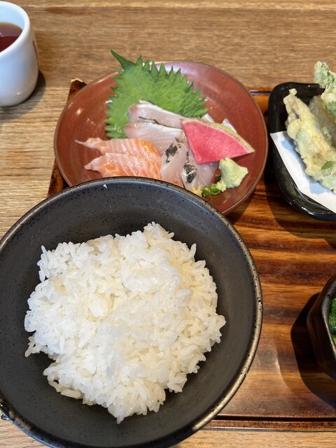 お刺身と天ぷら御膳(内税1,300円)を注文。サラダ付きである。刺身の内容はスタッフが説明してくれたのだが、鮭などだったと思う。美味しい。天ぷらはミツバやイカだったと思う。これも美味しい。更に青菜の小皿が付いている。ついでと言っては何だが、ライスが美味しい。今時、美味しい米を入手するのは難しいだろう。満足。