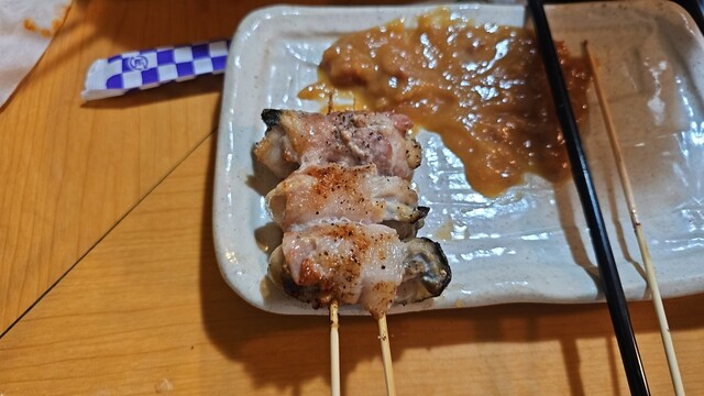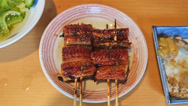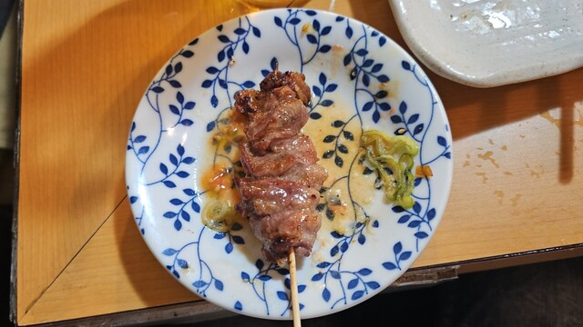 もつ焼きにメニューはあるが基本的には大将のおまかせになり5本で注文。この日はつくね、ハツ、タンシタ、ハラミ、うなぎ串と前回とは全然違うラインナップでどれも抜群に美味しかった。なぜかもつではないうなぎ串が入っていたが美味しかったので特に文句はない。