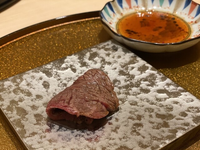 ちなみに、中には、ウズラの卵黄身、蟹身、芽葱が包まれていて、肉のレア感を残した状態でいただきます。
