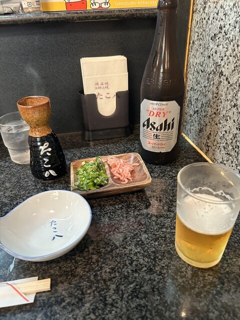 小腹が空いていたので明石焼き二人前と焼きそばにビールを注文しました。