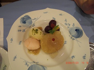 マンゴーシャーベットとオレンジ入りのクラッシュゼリーがけ、を頂いた。