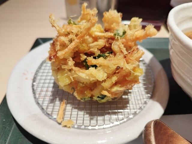 お店の人に席を案内してもらった。カウンター席しかないのだが、年齢層はかなりお高かめ。立ち食いそばの価格設定ではないのだが、かなり人気があるようである。天ぷらは常に揚げているようである。カウンターにあるメニューを見ていたら揚げ玉が50円でトッピングできる。かき揚げの単品は170円とリーズナブルである。何分も待たずにお食事が登場した。