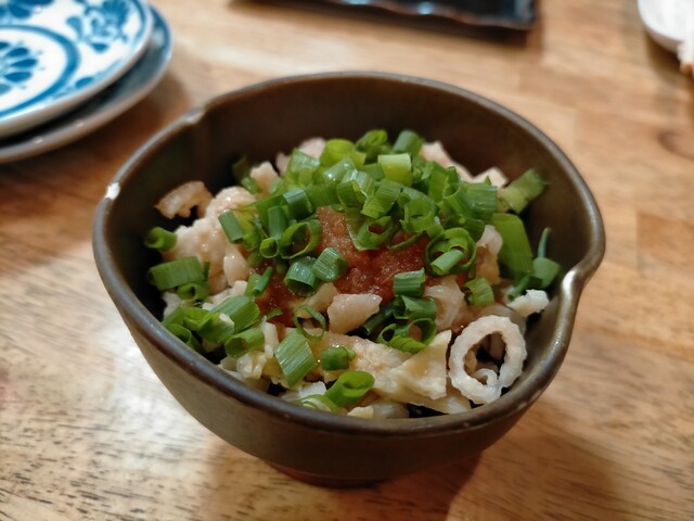 一皿には2本となるので4種類食べればいいかな?焼いてくれたのが1本づつだったので聞いてみたら「おひとり様には一本で注文受けます」と言っていただいた。だんご265円は軟骨入りの小粒のつくねであり、うまみが伝わり塩味でよかった~。トマトベーコン290円はスペシャルなソースでいただく。よく使う食材なのだが合わさると最強になる。通常メニューにないふりそで(鶏の肩肉)、はらみ(横隔膜)をお願いした。大串であり弾力があって美味しかった。明太ポテチ並850円なのだが一人なのでハーフサイズにもできるとのこと。ポテチとなっているのでポテトチップスかと思ったらスライスされたポテトだった。チーズ・明太子が合わさったポテトグラタンだった。