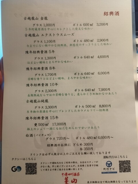 凝りに凝った食材のメニュー(菜譜)であり普段食べない食材をどう調理してくれるのか楽しみであった。四川料理なので辛いと味わう準備万全であった。食するすべてが出汁を感じたり和のテイストで驚かされる。一人前で提供してくれるので小皿でいただくのだが派手さはない。小鰭の山椒風味はビネガーのテイストが多く感じるが昆布も口の中に広がった。麻辣は使うのであるのだが真魚鰹の炙りと真蛸の優しい麻辣サラダで食べるものを組み合わせたりしていた。辛味も強くないし和食と言われたら素直に思ってしまう。鯨を紅油ソースでいただくのだが鯨の厚みがありこれが生なのが驚いてしまう。行者ニンニクとの相性もいい。給食で食べた竜田揚げしか食べないと思っていた。名古屋コーチンの棒棒鶏、これは味が想像できるだろう~と思ったら鶏の味が濃かった。ソースは辛めなので濃くがありご飯にかけて食べたかった。