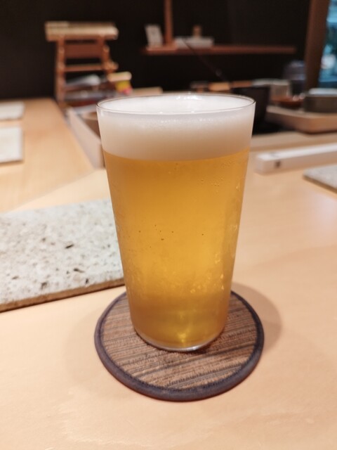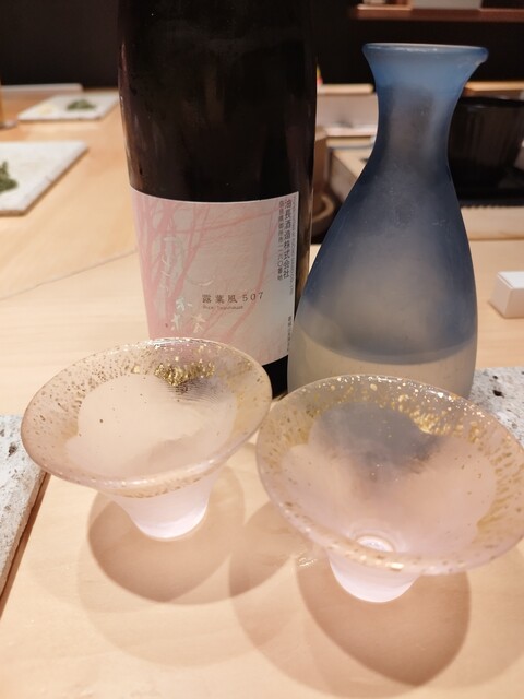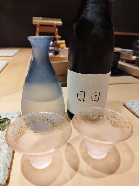 日本酒は「甘い・辛い」で指定して選んでくれた。「甘い」で選んでもらった日・日/京都伏見は微炭酸の日本酒で飲みやすさがあった。「辛い」で選んでもらった丹沢山/秀峰/純米酒はすっきり感あり辛すぎずのん兵衛は好きな味となる。「甘い」で選んでもらった風ノ森/奈良県は可愛らしいボトルで大将も好きとのこと。日本酒の種類が豊富であり、何でも知っている大将にお任せするのがいいと思う。お隣さんは厳選日本酒ペアリングコース25,200円 (税込)を注文しており、新政の陽乃鳥を飲んでいた。注文してもなかなか入ってこないという酒造であるが、あの味は忘れられないんだよな~。飲みたい!