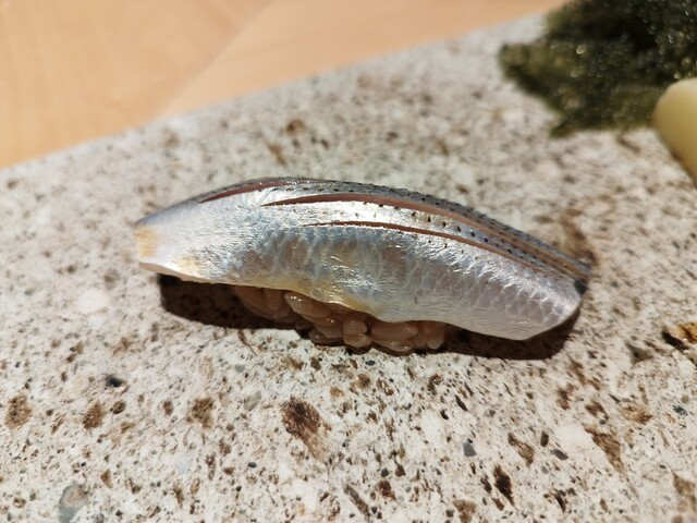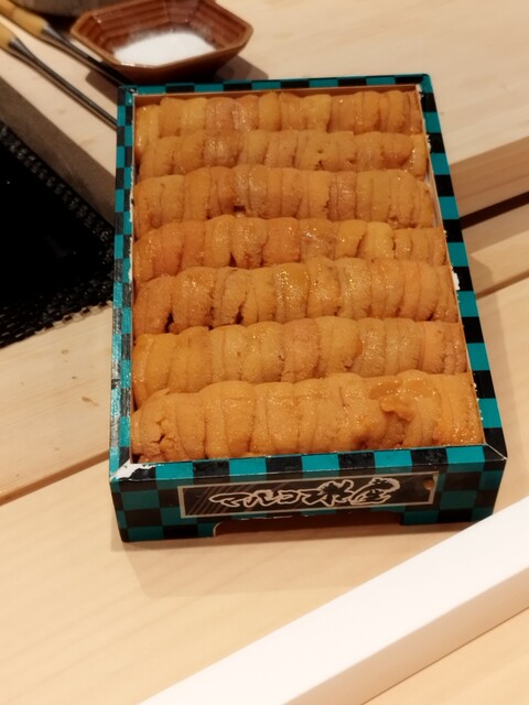 握り4貫いただいた。千葉県産さより、愛媛県産すみいか、銚子沖中トロ、鹿児島産車海老と海老みそ。さよりって食べる機会がないが品があっていい~。海老みそを乗せた車海老を食べたのは初めてである。半生状態であるのを見せてくれており、食感も風味も違いを感じた。うに箱を見せてくれ綺麗な色のウニが並んでいた。