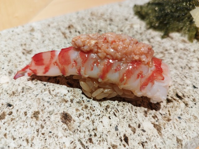 伊豆下田産あわびとあわび肝ソース、こんなに柔らかいあわびは食べたことがない。肝ソースが苦みがまったくなくまろやかである。ソースを残しておくように言われたのでシャリをいれてくれるんだな。シャリにはバルサミコ酢やりんご酢を使われていると言っていた。ご自身で酢を造っているようなことも言ってたかな?酢のとがった感がまったくないので、シャリが美味しく量を変更可能であると伝えられたが、シャリの量は絶対に変えたくなかった。