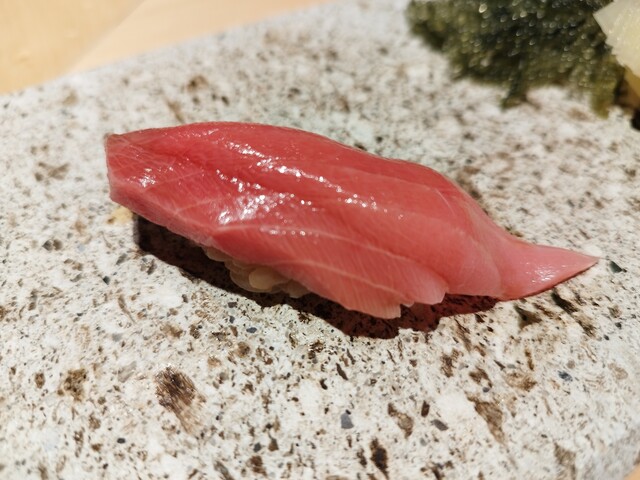 海ぶどうとガリが並べられた。海ブドウの食感がとても良い。ガリはちょっと厚めにスライスされていた。来た来た!手巻きすしを受け取った。トロ漬け手巻きで甘~い。酢飯が美味しい~おひつの中を見ると赤酢のシャリであった。春らしい前菜の富山県産ホタルイカ、北海道産あおやぎ、分葱をいただいた瞬間から日本酒が飲みたいと思ってしまった。アサヒ熟撰中1040円を飲んでいたがやはり鮨屋では最初から日本酒だな。千葉県勝浦産初ガツオには山わさびがのっており、まったく臭みのないさっぱりとした味わいであった。