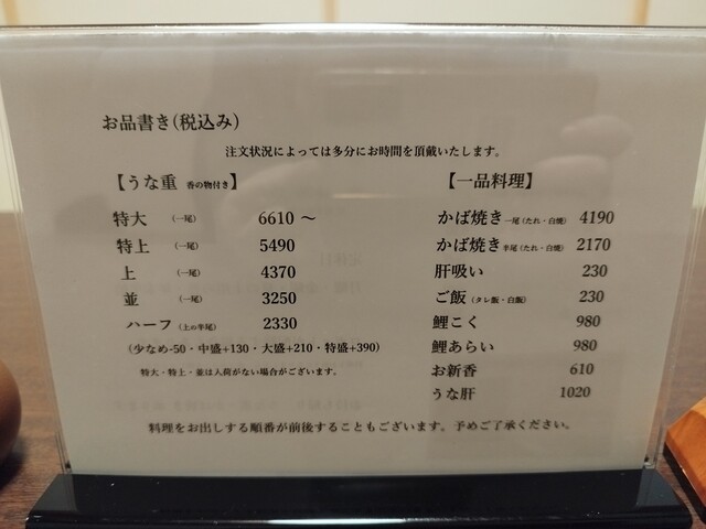 GW平日を有給休暇としなければならない。こんな時間がある時は行列する店に訪問しよう。子供の頃に一度訪問した覚えがあるが、うなぎを食べれるようになってからは初めてである。11時にオープンなので10時半に行けば余裕だろう!平日だし!お店は自宅から近い場所にあり自転車で向かったが、整理番号12番を受け取った。11時に整理番号1番のお客さんを店内に案内始めた。食事提供までに時間がかかり1.5時間以内要した。特大うな重6610円~、特上うな重5490円はすでになくなっていた。10時にお店到着して整理券を発券すれば特上うな重にありつけるかもしれない。第一陣最後のテーブルは和室6人席の座敷が残っていた。一人で座ることを心苦しいが仕方ない。