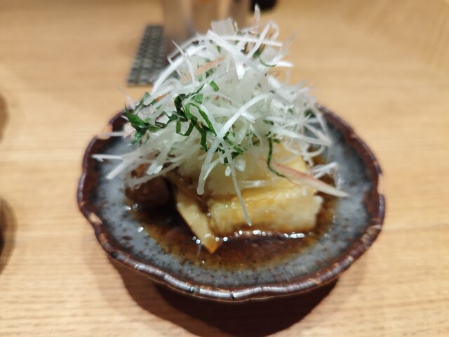 訪問したお店で品切れ・お腹いっぱいで食べられなかったものを「食堂 せざき」で補うことにした。「炭火晩酌屋 煙 門前仲町」自家製焼売3個、「炉端ともつ煮 炎」とうもろこしバター醤油土鍋ご飯。お店はコンパクトで11席で個室が一つ(テーブル4席)カウンター7席となっている。カウンター席を用意してくれていた。
