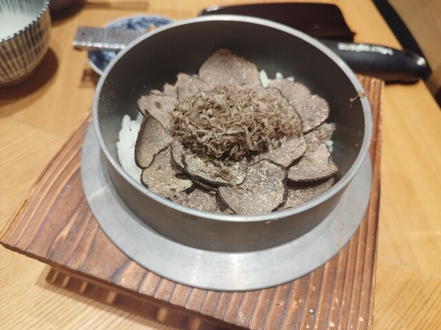 釜飯は何段階も驚かされた。蓋の上にトリュフが小皿にあった。これをどうするの?蓋をあけたらトリュフがいっぱい並べられていた。小さいがバターが中央にあった。チーズ削りでトリュフを削ってくれた。贅沢!贅沢!ご飯を混ぜてくれたのだがトリュフの匂いというかご飯の匂いが素晴らしく良い香り。ご飯の香りなのか?出汁の香りなのか?出汁ではなく牛テールのスープを使っているらしい。洋風炊き込みご飯を一番美味しく炊き上げたものなのである。是非一度白米とトリュフの組み合わせを食べてもらいたい。「世界三大珍味」のトリュフと日本のお米との組み合わせは素晴らしいものであった。香りを楽しめ・米の粒が立っていて一粒も残したくなく、本当は全部食べられたのだが、おにぎりとして持って帰った時の味を知りたかった。翌日レンジで1分チンして朝ごはんに食べたが香りは消えてなかった。確かに高価だが思い切って良かった。インスタグラム・今までの掲載されているメニューを見たが、秋刀魚と銀杏の釜飯3278円と焼きとうもろこしと金目鯛釜飯2838円が食べたかったな~。季節物なので今回のメニューにはなかった。