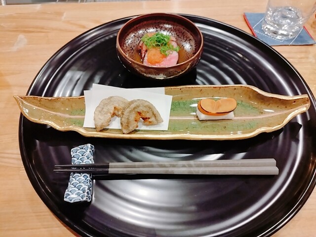 炊いた堀川牛蒡の唐揚げ、自家製からすみ餅、仙台牛イチボの炭火ロースト