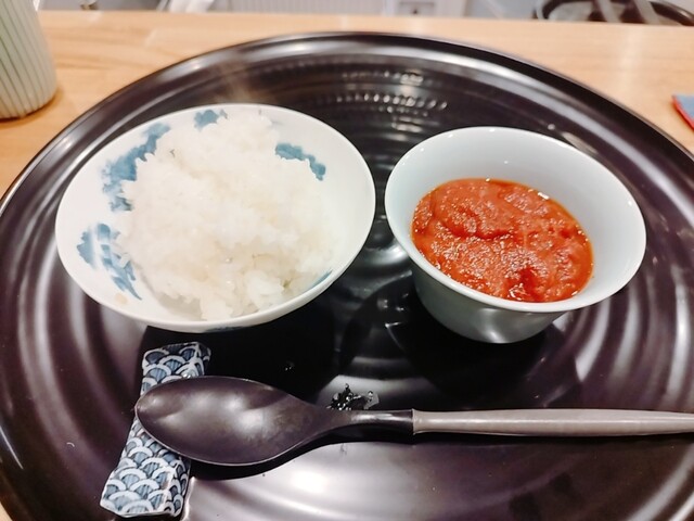 金沢産コシヒカリ(アイガモ農法の山下さん)。カレーはトマトベースで、渡部さんがスパイスを試行錯誤して完成させた逸品。小麦粉もバターも使ってないというが「これまで食べたカレーで一番オイシイ」。
