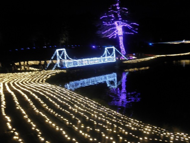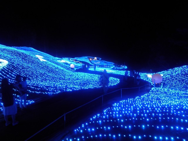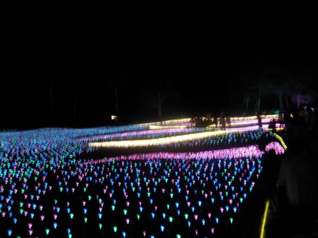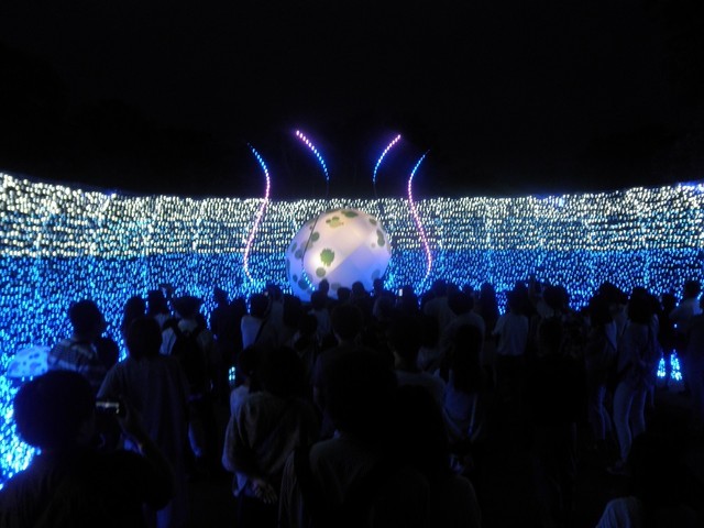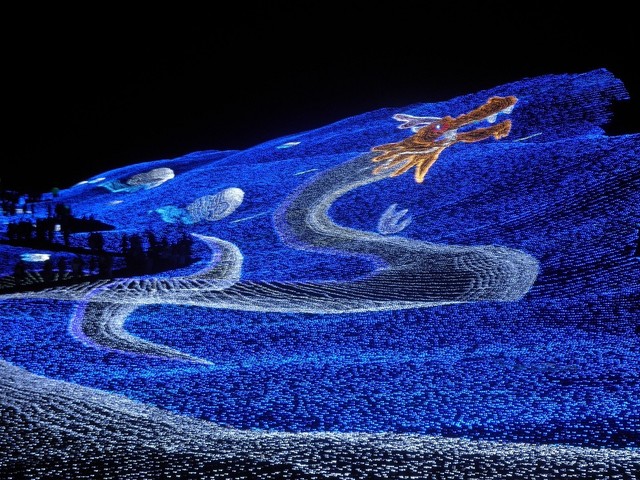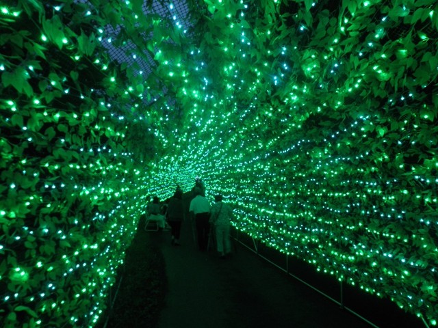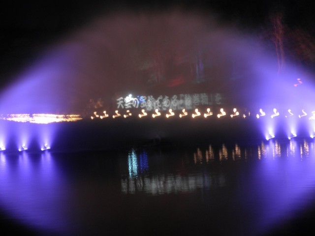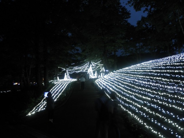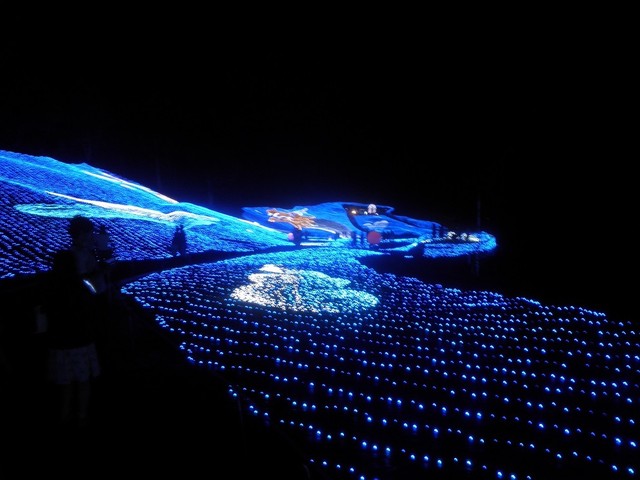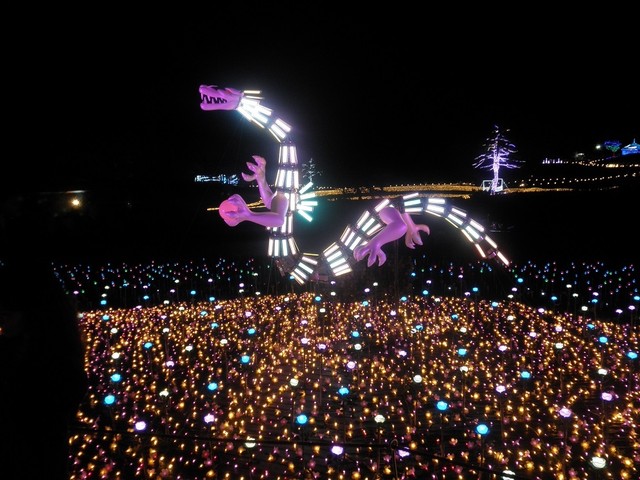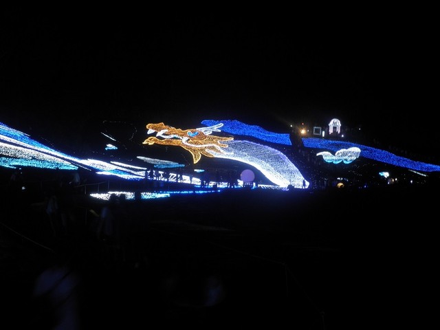 夜はメインイベントイルミネーションを見学。噴水でのプロジェクションマッピングや水のカーテンでのプロジェクションマッピングが見られました。2匹の龍と風神雷神をテーマに構成されています。長~い光のトンネルから始まるのですが、緩やかなのぼりが続き、ところどころちょっとだけ急になっており、結構しんどいです。(食事してお酒も飲んでいたので・・・)イルミネーションよりプロジェクションマッピングがメインの感じがして、イルミネーションとしてはハウステンボスの方が見ごたえありました。