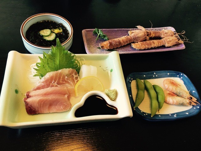スタンダードコース 第一陣 刺し盛り 海老、枝豆 しゃこ