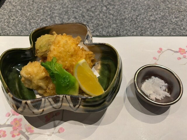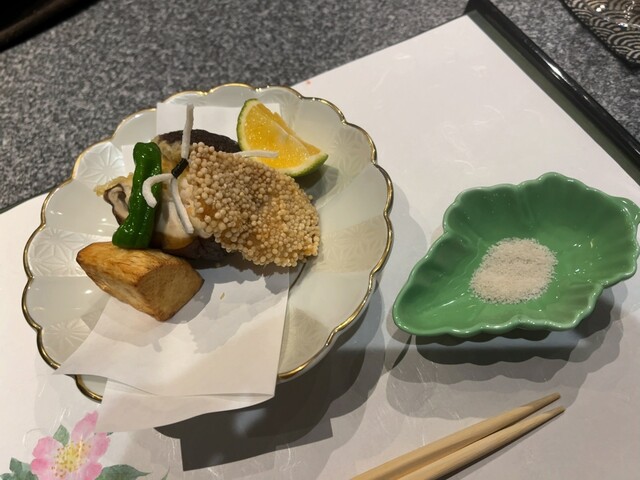 揚物として,鱧と真ダチ等の盛り合わせを岩塩で頂く