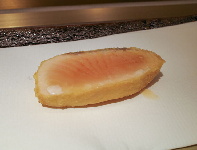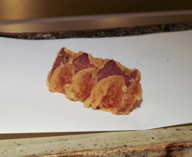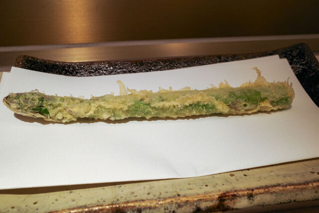 今どきの天ぷらのトップランナーたちは、天ぷらの概念を超えた、油を使った料理という観点で、いわゆる天ぷらの概念を突き抜けた料理を出す店が多い印象ですが、「くすのき」さんは、あくまで「天ぷら」という枠の中で、これまで伝統的な江戸前天ぷらが使ってこなかった素材を使い、それに衣の硬さや火入れを合わせて、最高の状態の天ぷらを出す そういうお店です。