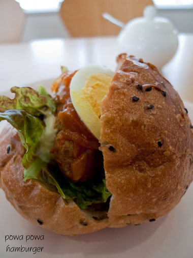黒ゴマが表面にまぶされた 固めのパンにハンバーグと卵 サニーレタス