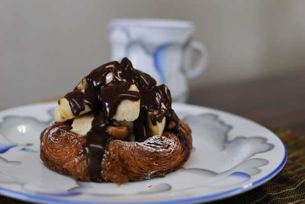 多層のデニッシュにバナナとマカダミアンナッツが積み重なりチョコでコーティングされた