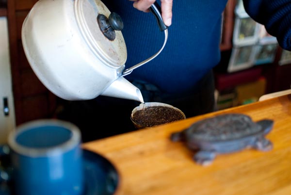 豆を挽いて ペーパードリップで珈琲をおと・・ お・・・?アルマイトのやかんでお湯注いでるし〜(爆)
