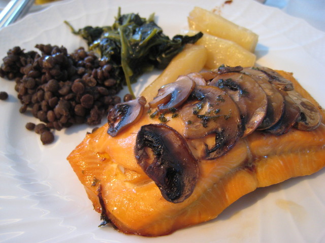 鱒のフィレオーブン焼 マッシュルームのソテー添え