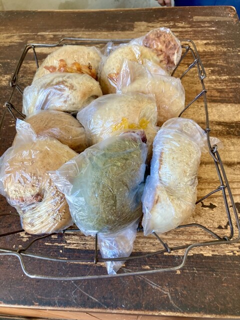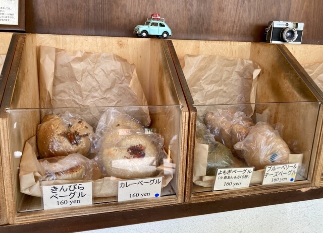 (左上)麻婆茄子ベーグル160円、(手前)マーマーレード& チーズクリームベーグル160円