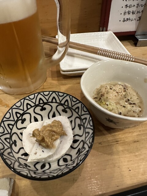 まずはビールと名物刺身こんにゃく、揚げ銀杏、塩あん肝でスタートです。