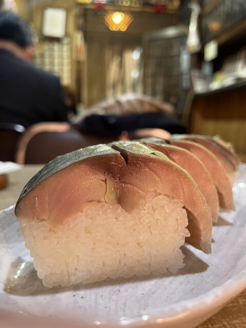 最初のお客さんから順番に料理が運ばれてくる。ようやくキター!そして目を奪われた。半身の鯖の身の厚さとシャリとのバランス、刀剣のようなキラキラした皮目。くぅー、鯖寿司で正解だった。
